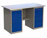 Верстак двухтумбовый поставляется в разобранном виде (4 элемента). Нагрузка на столешницу до 600 кг. Стандартный цвет: корпус - серый глянец RAL 7030, ящики и двери тумб - синий RAL 5017. Размеры:855x1400x700 мм. Масса: 111 кг.