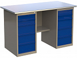 Верстак двухтумбовый поставляется в разобранном виде (4 элемента). Нагрузка на столешницу до 600 кг. Стандартный цвет: корпус - серый глянец RAL 7030, ящики и двери тумб - синий RAL 5017. Размеры:855x1400x700 мм. Масса: 81 кг.