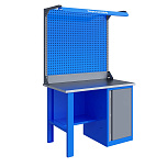 Однотумбовый. Допустимая нагрузка на столешницу 750 кг. Опорные элементы выполнены сварными из холоднокатаной стали. Верстак состоит из столешницы, опоры, тумбы P5 с четырьмя малыми и одним большим ящиком, полки-стенки, двойного экрана с кронштейнами и комплекта освещения. Все металлические элементы покрыты полиэфирной порошковой краской. Столешница из фанеры марки ФСФ толщиной 24 мм, которая покрыта лаком-антисептиком и листом оцинкованной холоднокатаной стали толщиной 1,2 мм. Размеры (ВхШхГ) 1965x1196x696 мм.