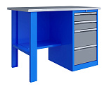 Однотумбовый. Допустимая нагрузка на столешницу 750 кг. Опорные элементы выполнены сварными из холоднокатаной стали. Верстак состоит из столешницы, опоры, тумбы P4 с двумя малыми и двумя большими ящиками, полки-стенки, двойного экрана с кронштейнами. Все металлические элементы покрыты полиэфирной порошковой краской. Столешница из фанеры марки ФСФ толщиной 24 мм, которая покрыта лаком-антисептиком и листом оцинкованной холоднокатаной стали толщиной 1,2 мм. Размеры (ВхШхГ) 1965x1196x696 мм.