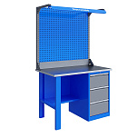Однотумбовый. Допустимая нагрузка на столешницу 750 кг. Опорные элементы выполнены сварными из холоднокатаной стали. Верстак состоит из столешницы, опоры, тумбы P3 с тремя большими ящиками, полки-стенки и одинарного экрана с кронштейнами. Все металлические элементы покрыты полиэфирной порошковой краской. Столешница состоит из фанеры марки ФСФ толщиной 24 мм, которая покрыта лаком-антисептиком и листом оцинкованной холоднокатаной стали толщиной 1,2 мм. Размеры (ВхШхГ) 1470x1196x696 мм.