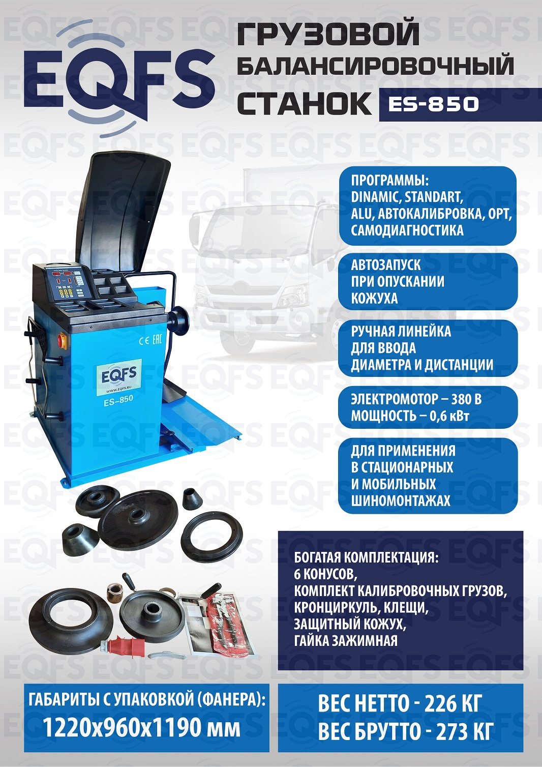 + ES-850 Балансировочный станок для балансировки колес легковых и грузовых автомобилей. Колесо «в сборе» Ø до 1200 мм, вес до 150 кг. Диски Ø 13-24” ширина 1,5-20”, подключение 380 В. Встроенный пневмоподъемник.  Гарантия до 18 мес.