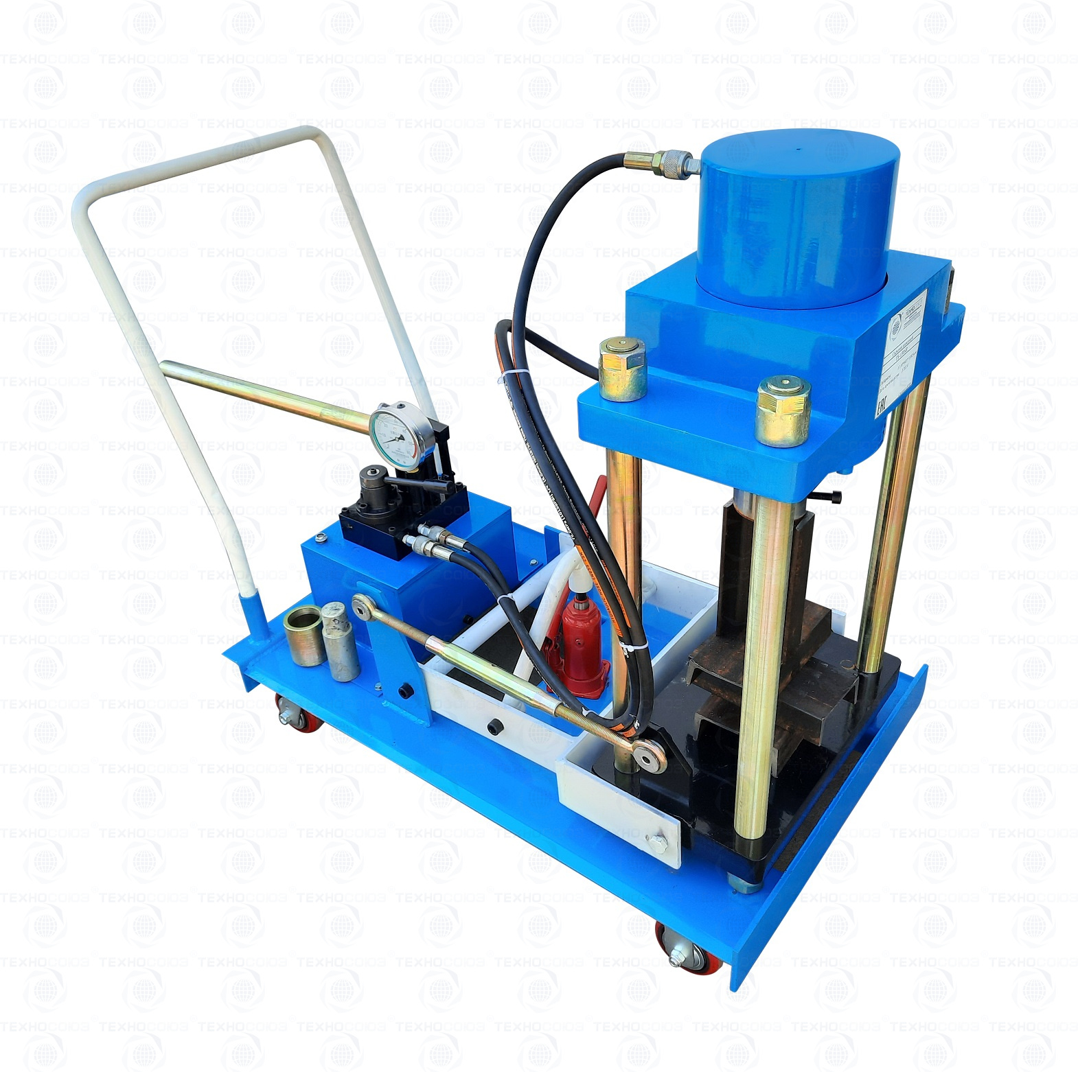 Мобильный. Позволяет работать под разными углами 1 человеку. Сокращает время ремонта. Для выпрессовки шкворней из поворотной цапфы. Для коммерческих и грузовых авто отечественного и импортного производства: MAN, MERSEDES, SCANIA, VOLVO, Корейские и Китайские автомобили, а также трактора, погрузчики, спецтехника. Ручной гидравлический привод. Рабочее окно 400x320 мм. Усилие 150 тонн. Можно использовать при выездных работах. Применяется для выпрессовки подшипников, валов, втулок, сайлентблоков.