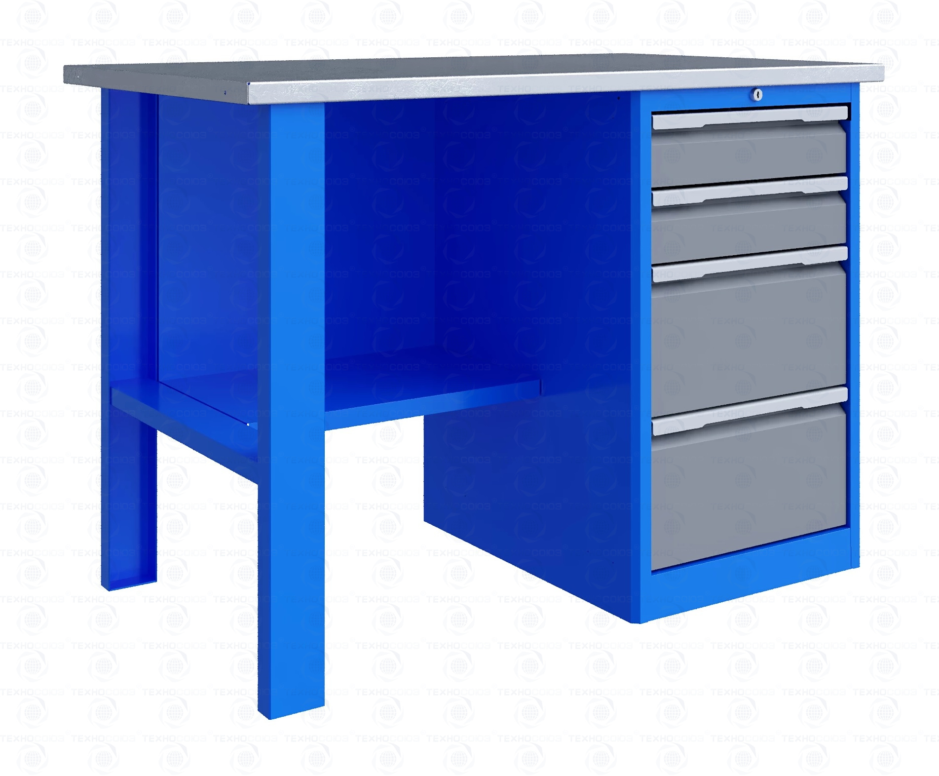 Тумба верстака - сварная. Ящики в тумбе устанавливаются на шариковых телескопических направляющих полного выдвижения. В тумбе P4 установлено два малых и два больших ящика. Внутренние размеры малых ящиков (ВхШхГ), не более: 103 х 397 х 520 мм. Внутренние размеры больших ящиков (ВхШхГ), не более: 222 х 397 х 520 мм. Тумбы с ящиками снабжены общим центральным замком с поворотом ригеля 180 градусов и подпружиненной тягой. В комплекте два ключа.