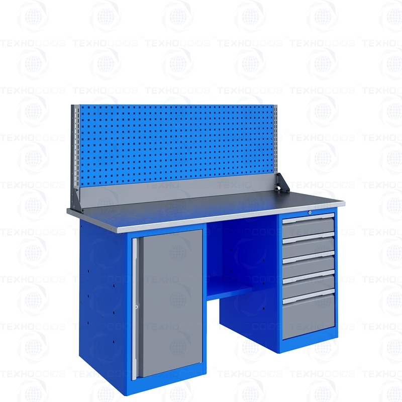 Тумбы верстаков выполнены сварными. Ящики в тумбах устанавливаются на шариковых телескопических направляющих полного выдвижения. В тумбе P5 установлено четыре малых и один большой ящик. Внутренние размеры малых ящиков (ВхШхГ), не более: 103 х 397 х 520 мм. Внутренние размеры больших ящиков (ВхШхГ), не более: 222 х 397 х 520 мм. Тумбы с ящиками снабжены общим центральным замком с поворотом ригеля 180 градусов и подпружиненной тягой. В тумбе P7 установлено две полки. Полки устанавливаются на парах специальных формованных зацепов, выполненных в боковых стенках тумбы. Имеется возможность смены стороны открывания двери. Дверь тумбы снабжена центральным замком с поворотом ригеля 180 градусов. В комплекте два ключа с каждой тумбой.