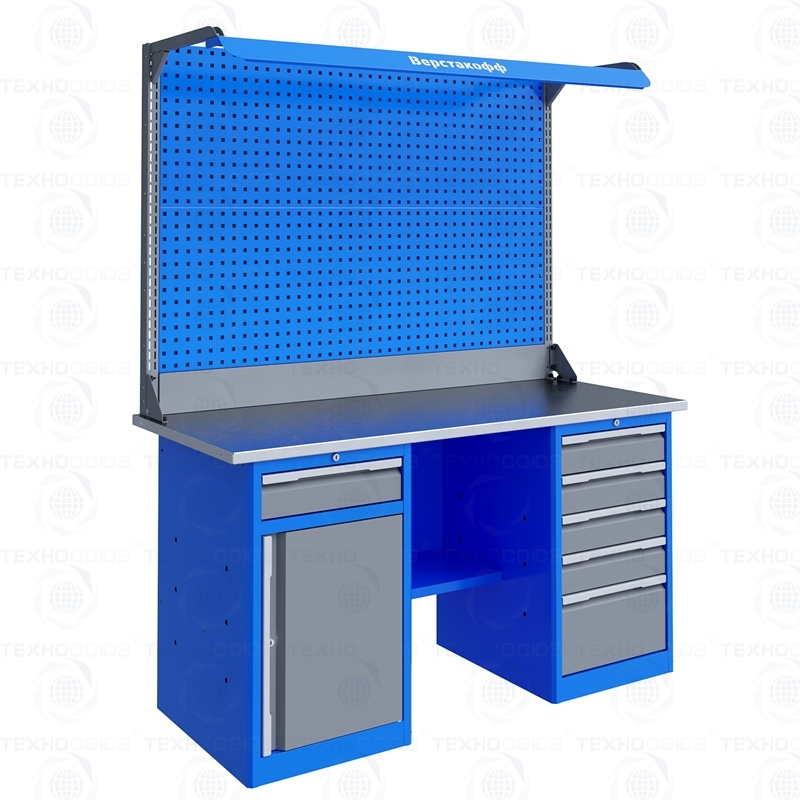 Двухтумбовый. Допустимая нагрузка на столешницу 1000 кг. Опорные элементы выполнены сварными из холоднокатаной стали. Для выполнения сборочных, ремонтных, слесарных, монтажных и других видов работ на производстве, в сервисных центрах, мастерских, гаражах, а также для обучения технологии в учебных заведениях. Комплектуется полкой-стенкой, расположенной под столешницей для удобного размещения габаритного инструмента и оснастки. Размеры верстака: 855x1596x696 мм. Вес: 107 кг. Поставляется в 4 комплектациях на выбор.